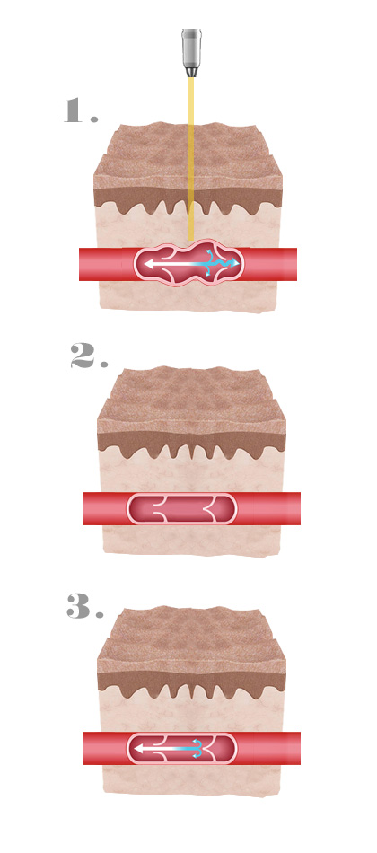 Światło lasera przykładane jest na skórę wzdłuż ścieżki zmiany naczyniowej, a ciepło koaguluje i zamyka naczynie (fototermokoagulacja), nie uszkadzając skóry ani otaczających tkanek.